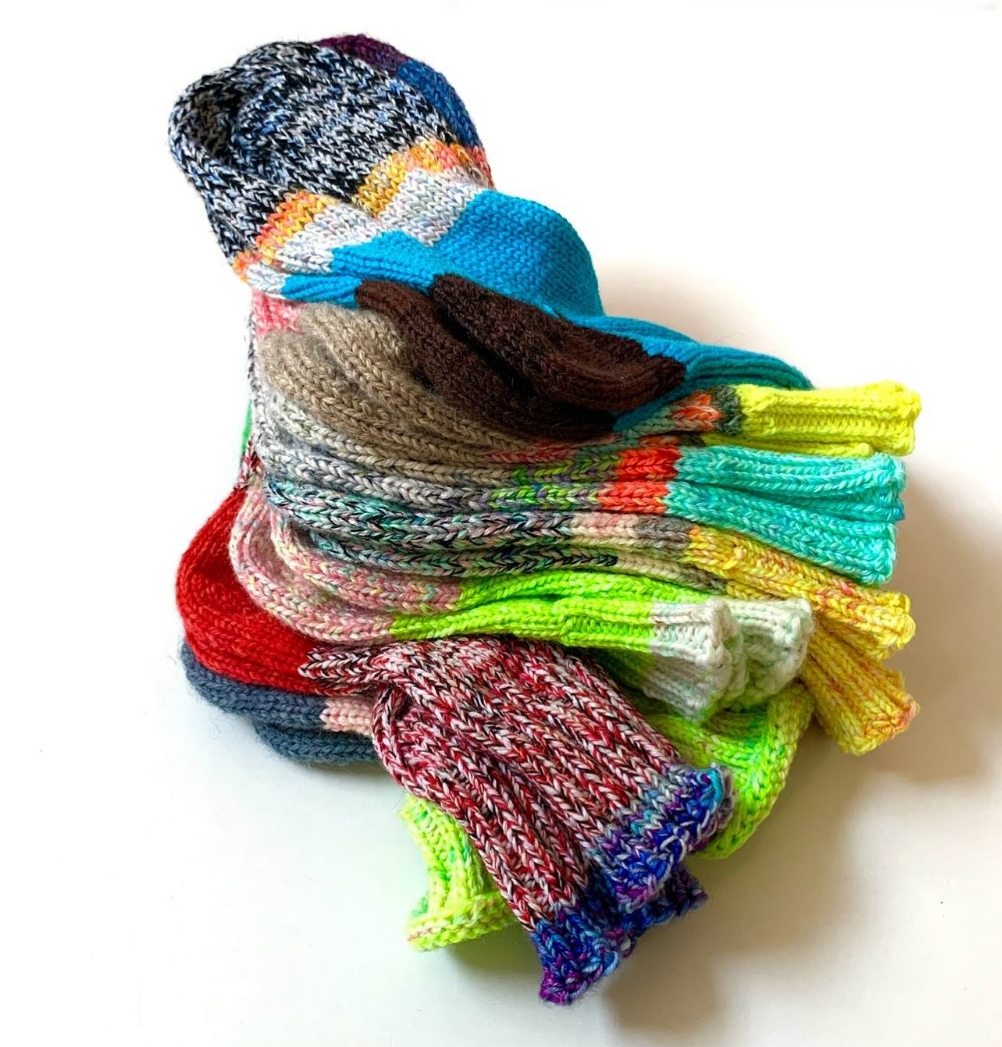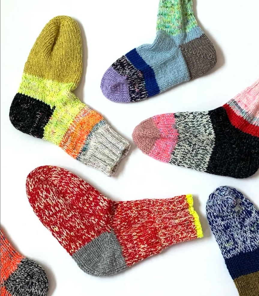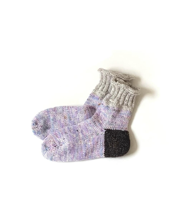 しろはこは、毛糸が入った白い箱から名前をつけた手編み靴下のブランド。もともと靴下好きだった作者が、子どもの誕生をきっかけに「本当に暖かく、色のきれいな靴下が欲しい」と思ったことから制作が始まりました。編み方は、日本のスキー文化の草分けであり、生活に根ざしたものづくりの哲学を持っていた**猪谷 六合雄**が考案した「猪谷さんの靴下」をベースにしています。色合わせはすべて一から考え、欲しい色の毛糸が見つからないときは自ら染めることも。ウール100%の毛糸を2〜3本合わせて編むことで、空気を含んだようなボリュームと高い保温性、しっかりとした強度を持たせています。毛糸の質感や素材の表情も大切にしながら、足元から元気をもらえる靴下を届けています。