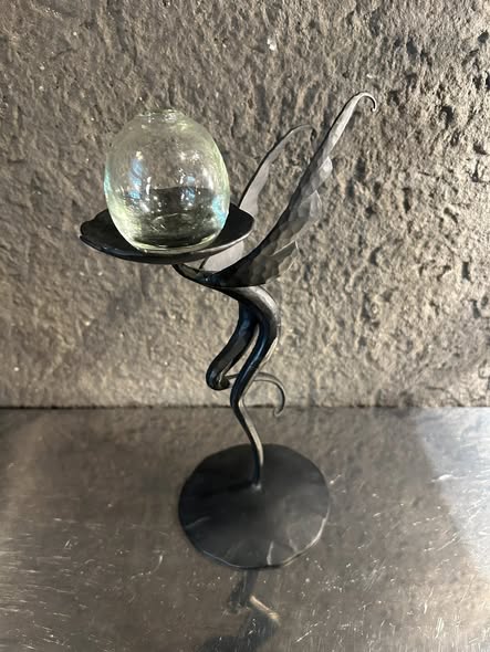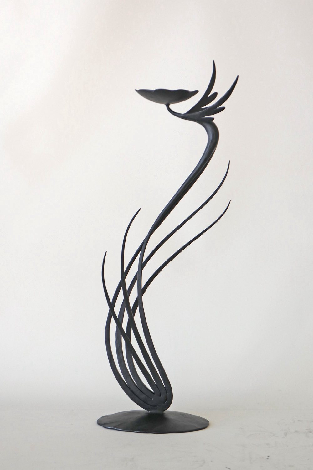 金沢美術工芸大学を卒業後、手わざを活かしたものづくりを志し、鍛冶師の道を選ぶ。鉄やチタンを自在に扱い、花器やお香立てなどの作品を制作。これまでの作品では、流れるような有機的な曲線を持ち味とし、頭で設計するよりも感覚を重視しながら、手の動きの中でかたちを立ち上げてきた。近年は作風を広げ、曲線だけでなく直線的な表現にも取り組み、動きのある造形から、静けさと余白を感じさせるシンプルなかたちへと展開している。素材の力強さと、研ぎ澄まされた美意識が共存する作品は、使う人の暮らしに静かな緊張感と深みをもたらす。